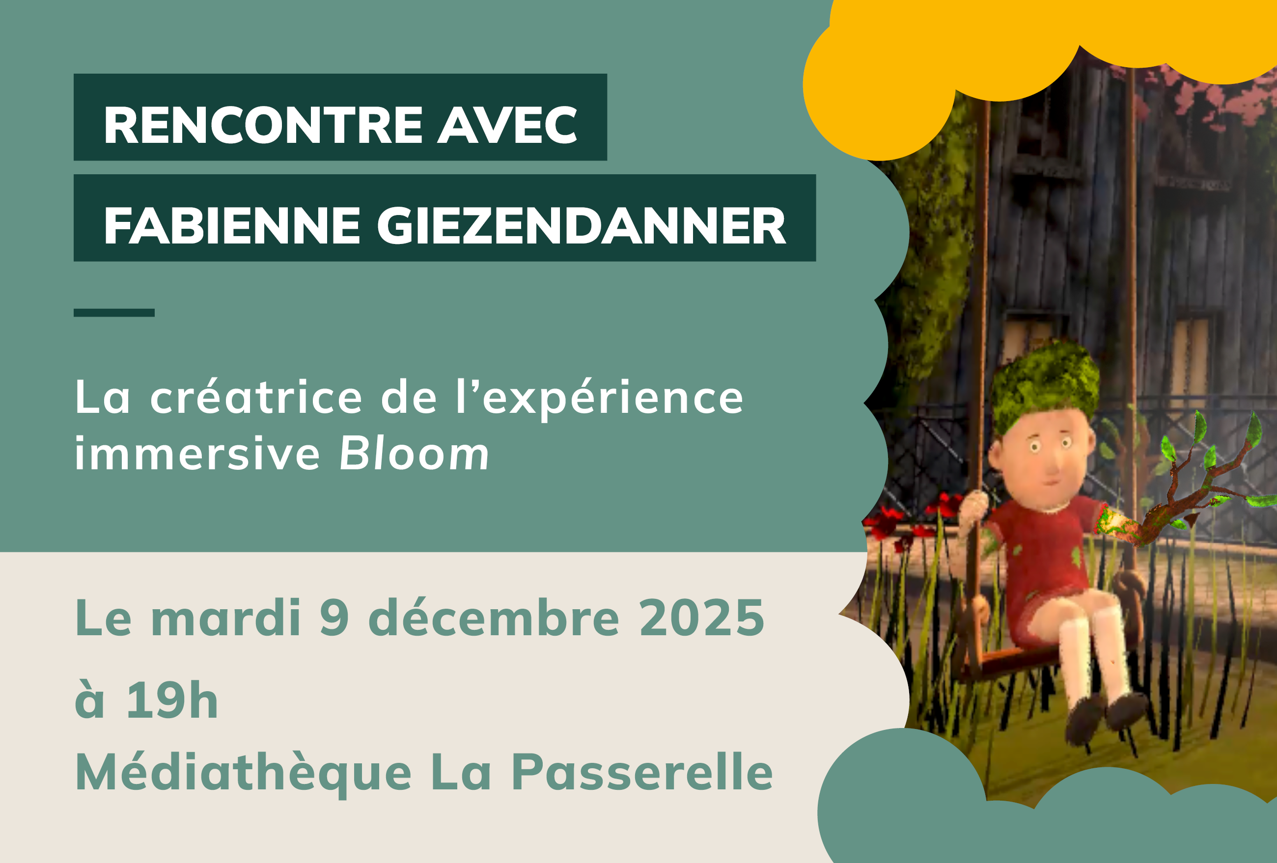 La créatrice de l'expérience immersive Bloom (actuellement au Musée Courbet) nous parlera de ses projets. Réalisatrice et scénariste d’animation, Fabienne Giezendanner travaille sur la réalité virtuelle et son pouvoir d’immersion. Attachée à un cinéma sensible, apte à faire réfléchir et voyager le spectateur, elle propose des œuvres innovantes, fréquemment reconnues dans des festivals internationaux. Les fictions immersives et interactives sont pour elle un moyen de pousser les frontières des genres artistiques en débordant sur le théâtre, la peinture ou la musique. Par le biais d’interactivités naturelles, elle aime donner au spectateur la possibilité de transformer le graphisme, les sons et le rendre acteur de son expérience. Inscription conseillée. | |